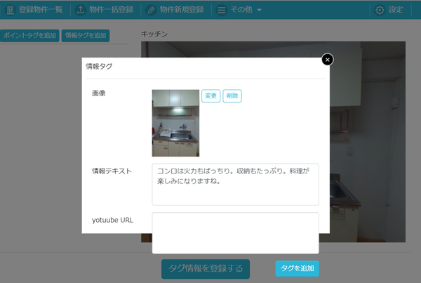 情報タグとは任意の「画像」「情報テキスト」「YouTube URL」を設定しクリックした際にタグの内容が確認できる機能です。