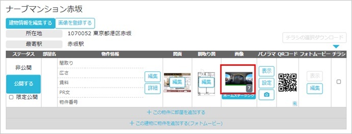 登録物件一覧、物件情報の画像サムネイルをクリック(タップ)します。