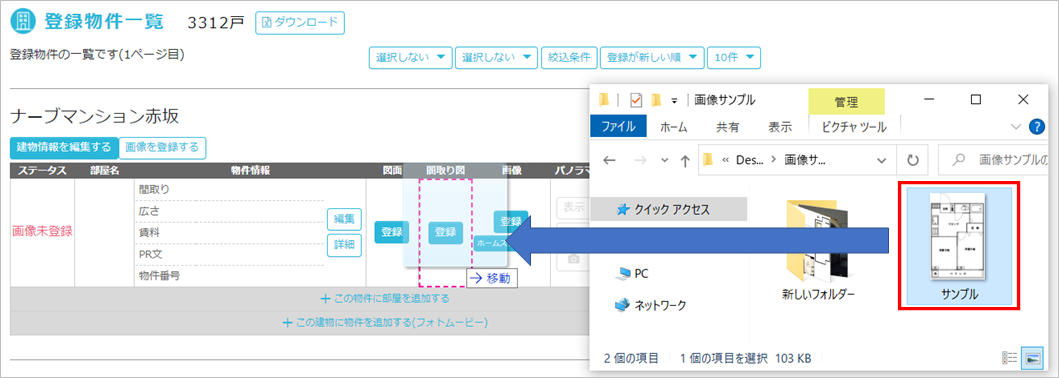 登録物件一覧より、図面を登録したい物件の「間取り図」部分に任意のファイルをドロップ&ドロップします。
