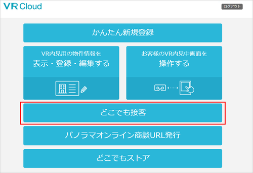 VR Cloud管理画面のトップ「どこでも接客」をクリック(タップ)します。